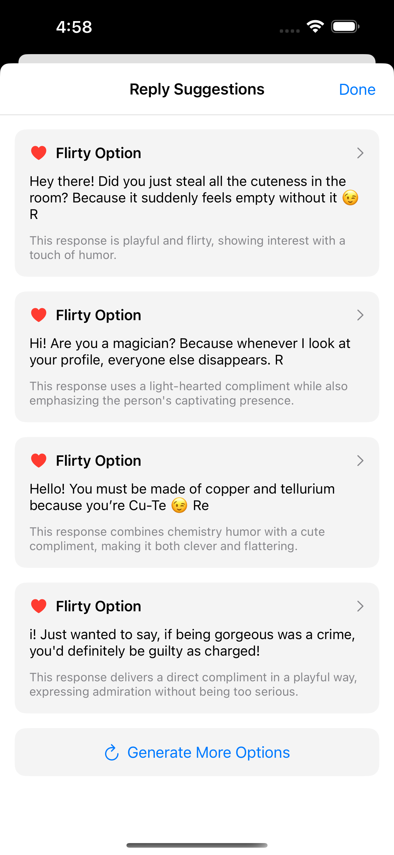 生成充满魅力的调情回复,增加浪漫氛围,让对话更有趣味性